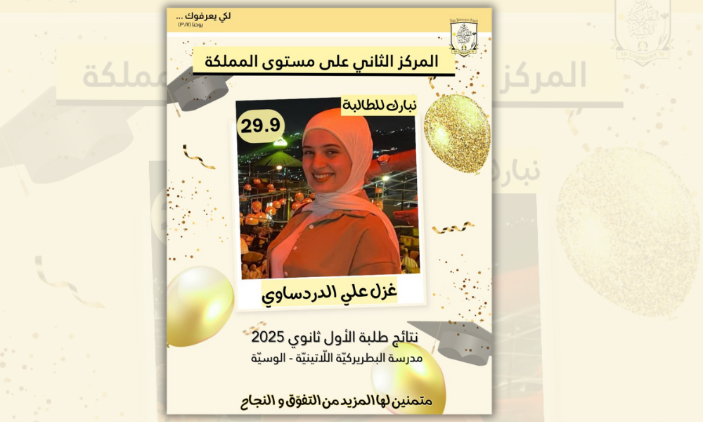 تتقدّم أسرة البطريركيّة اللّاتينيّة ممثّلة بغبطة البطريرك الكاردينال بييرباتيستا بيتسابالا جزيل الوقار، وصاحب السّيادة المطران إياد الطّوال جزيل الاحترام، وقدس الأب الدّكتور فراس نصراوين المدير العامّ للمدارس، والكوادر الإداريّة والتّدريسيّة، بأحر التّهاني للطالبة غزل علي محمود الدردساوي لحصولها على المركز الثاني على مستوى المملكة في نتائج طلبة الأول ثانوي لعام 2025، متمنين لها المزيد من التفوق والنجاح المستمر